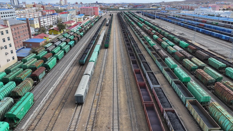 10月18日,在中國鐵路哈爾濱局集團有限公司綏芬河站南場,滿載進口貨物的列車等待解體換裝(無人機照片)。