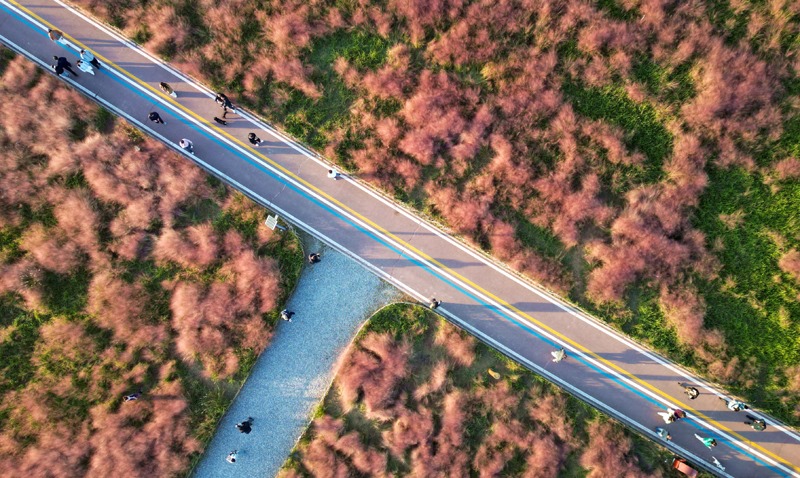 10月18日,游客在山東省東營市東營區(qū)耿井濕地粉黛亂子草“花?!迸恼沾蚩ǎo人機(jī)照片)。