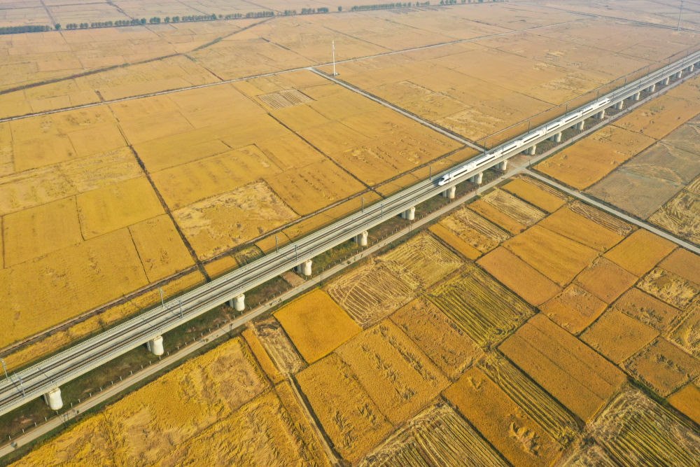 10月14日,在吉林省公主嶺市,一列高鐵列車沿著田間的鐵路線穿行(無人機照片)。2025年,吉林省深化農(nóng)機研發(fā)、制造、推廣、應(yīng)用一體化試點示范,農(nóng)作物耕種收綜合機械化率達(dá)94.6%。新華社記者 張楠 攝