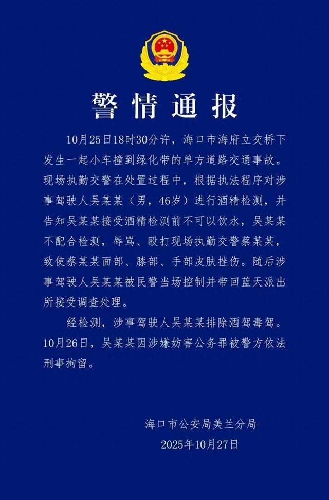 經(jīng)檢測(cè),涉事駕駛?cè)藚悄衬撑懦岂{毒駕。10月26日,吳某某因涉嫌妨害公務(wù)罪被警方依法刑事拘留。