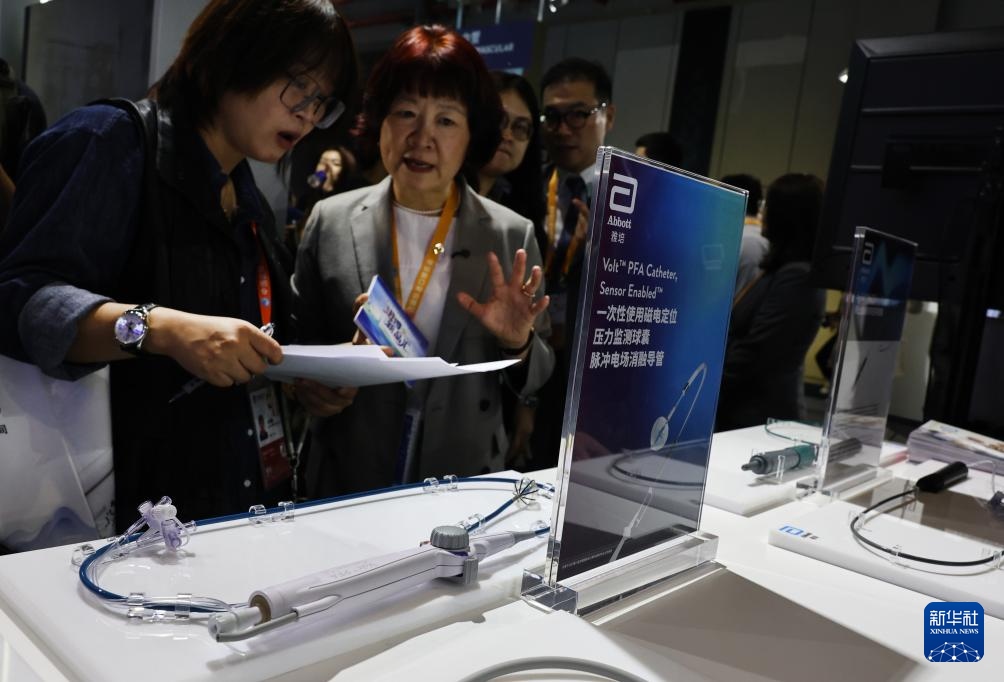 11月6日,參觀者在雅培公司一款磁電定位壓力監(jiān)測球囊脈沖電場消融導管展品前駐足觀看,這是該產品的亞洲首展。