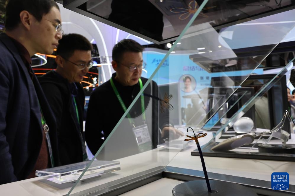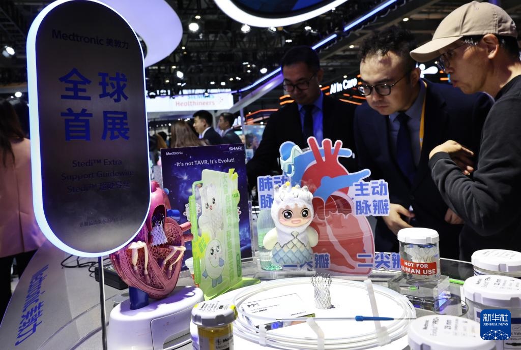 11月6日,參觀者在美敦力公司一款超硬導絲產品展臺前駐足觀看,這是該產品的全球首展。