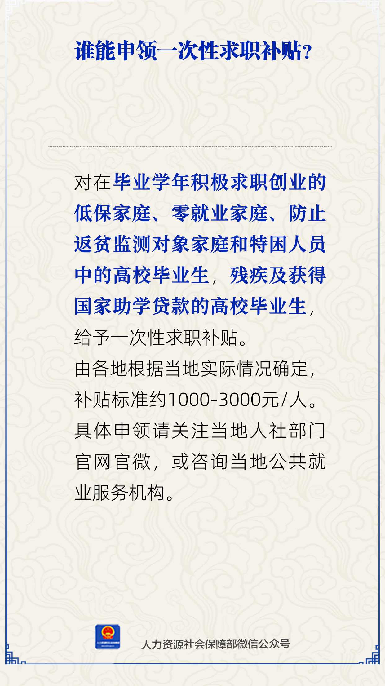 對在畢業(yè)學年積極求職創(chuàng)業(yè)的低保家庭、零就業(yè)家庭、防止返貧監(jiān)測對象家庭和特困人員中的高校畢業(yè)生,殘疾及獲得國家助學貸款的高校畢業(yè)生,給予一次性求職補貼。