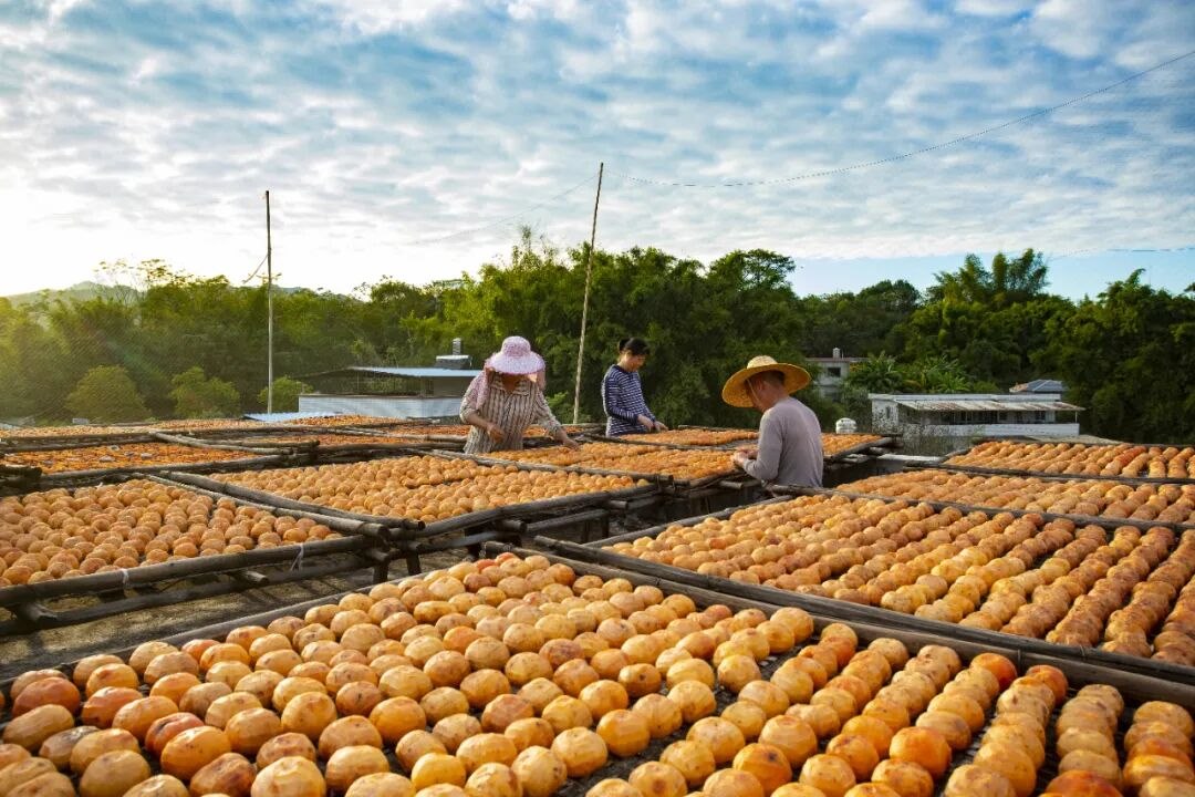 在廣東省梅州市平遠縣石正鎮(zhèn)中東村,村民正趁晴好天氣曬制柿餅。平遠縣供銷總公司通過合作社與農戶簽訂收購合約,使石正柿花成為當?shù)剞r民增收致富的特色產業(yè)。馮錫權攝(影像中國)