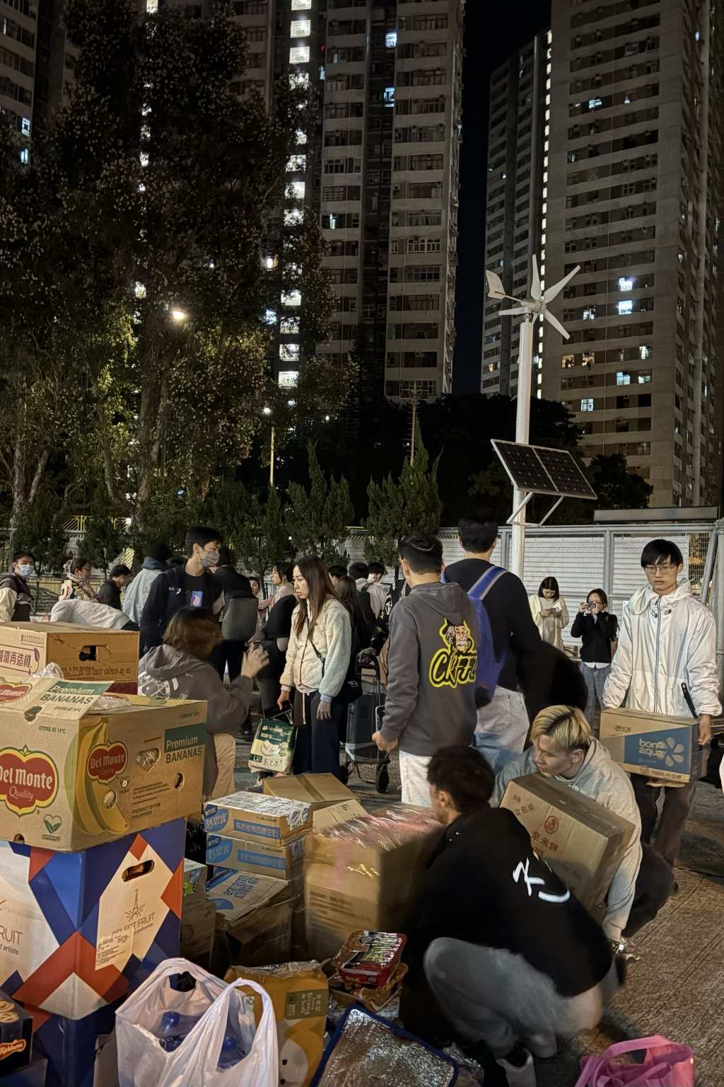 收到物資后,香港義工團(tuán)隊(duì)“愛心隊(duì)”在校內(nèi)未做停歇,一名隊(duì)員介紹說,本次支援隊(duì)伍共19人,都是得知災(zāi)情后從香港各區(qū)自發(fā)趕來。凌晨3點(diǎn),他們和市民忙著把成堆的飲用水和食品分開摞齊,好留出通道分發(fā)物資。其間,一些人前往廣福商場(chǎng)為露宿居民發(fā)放被褥、暖貼和水。