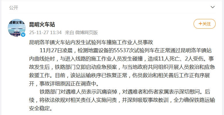 據(jù)昆明鐵路局昆明站官方微博消息,11月27日凌晨,檢測(cè)地震設(shè)備的55537次試驗(yàn)列車在正常通過(guò)昆明洛羊鎮(zhèn)站內(nèi)曲線處時(shí),與進(jìn)入線路的施工作業(yè)人員發(fā)生碰撞,造成11人死亡、2人受傷。事故發(fā)生后,鐵路部門立即啟動(dòng)應(yīng)急預(yù)案,與當(dāng)?shù)卣餐M織開(kāi)展人員救治和應(yīng)急救援工作。目前,該站運(yùn)輸秩序已恢復(fù)正常,傷員救治和相關(guān)善后工作正有序展開(kāi),事故詳細(xì)原因正在調(diào)查中。