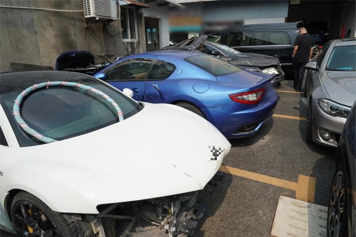 涉案維修廠內(nèi)存放的事故豪車(央廣網(wǎng)發(fā) 上海警方供圖)