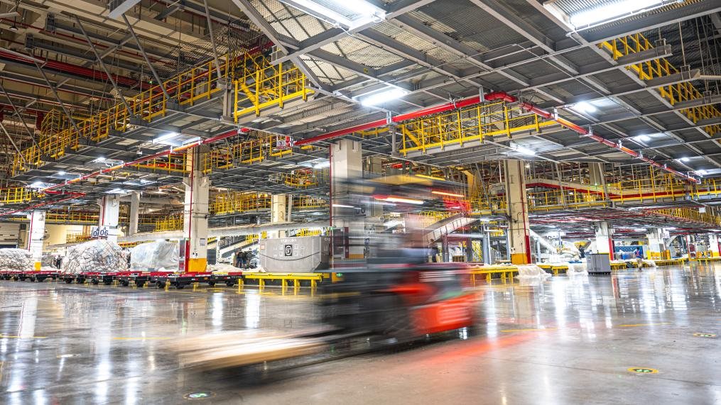 跟隨轉(zhuǎn)運(yùn)車,記者來到了建筑面積達(dá)75萬平方米的機(jī)場(chǎng)“工”字形轉(zhuǎn)運(yùn)中心。這里,“快點(diǎn)、快點(diǎn)”的催促聲與機(jī)器有節(jié)律的運(yùn)行聲形成交響,在2萬多臺(tái)自動(dòng)分揀設(shè)備和50多公里長(zhǎng)傳送帶的支持下,工人們熟練地將數(shù)量規(guī)格不一的包裹抱起、分類、組合、打包,再拼裝出多個(gè)符合航空貨運(yùn)規(guī)格和形狀要求的大包裹。