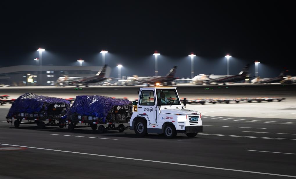 子夜時(shí)分,記者驅(qū)車來到這座機(jī)場(chǎng)時(shí),撲面而來的是一派“不夜空港”的繁忙景象:雪亮的停機(jī)坪上,貨機(jī)剛一停穩(wěn),工作人員便操控牽引車、加油車、轉(zhuǎn)運(yùn)車簇?fù)矶?,卸貨、加油、檢查,井井有條,一刻也不耽誤。