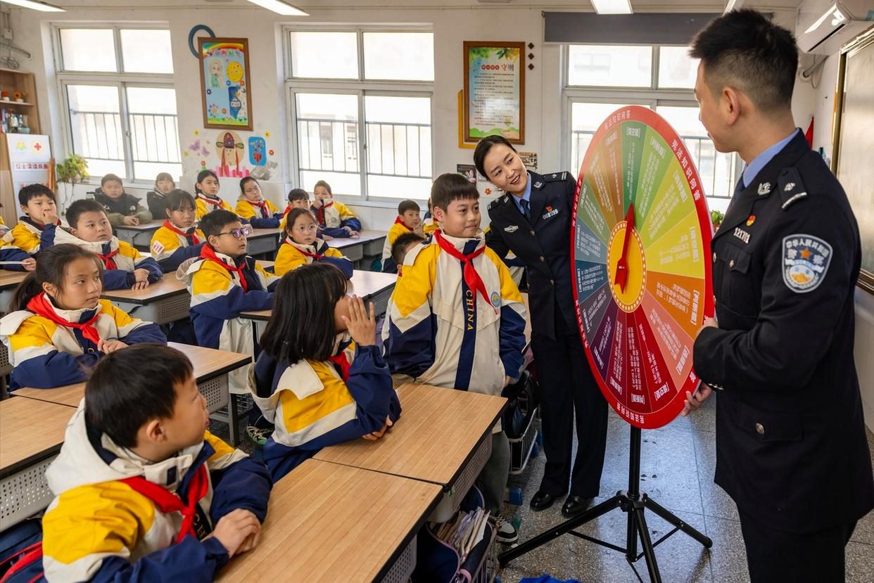 12月2日,安徽省舒城縣公安局網(wǎng)監(jiān)大隊聯(lián)合五顯派出所走進五顯鎮(zhèn)中心學校課堂,為同學們帶來了一堂沉浸式、互動式的法治教育課。(工人日報通訊員 王可海 攝)