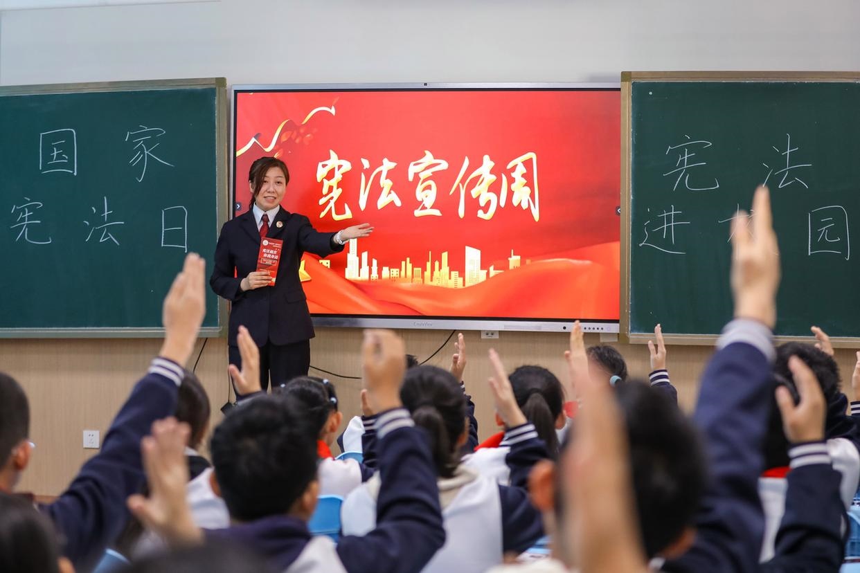 12月3日,山東省棗莊市市中區(qū)人民法院組織法官走進校園,開展主題宣傳活動,向?qū)W生普及憲法知識、宣傳法治觀念、弘揚憲法精神。(工人日報通訊員 孫中喆 攝)