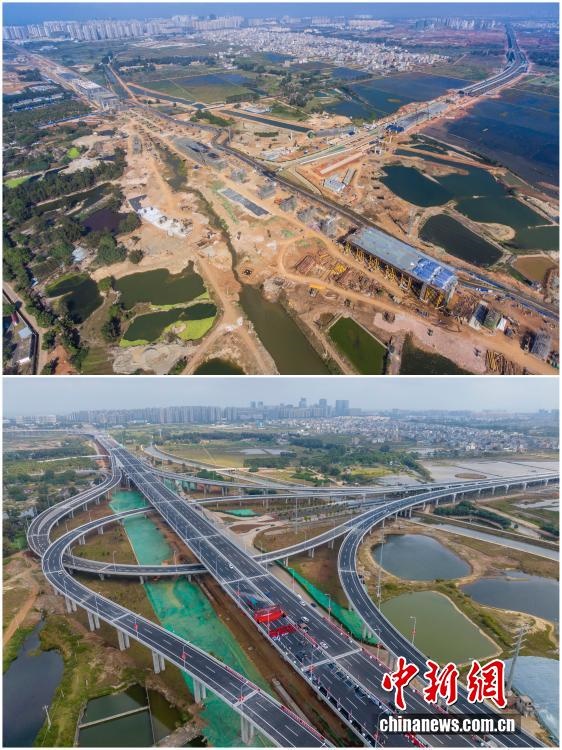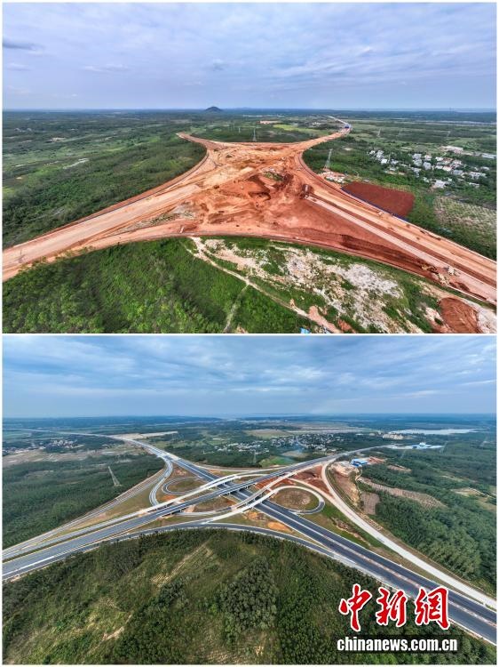 2025年12月18日,海南自由貿(mào)易港正式啟動全島封關。近年來,海南自貿(mào)港建設在利好政策帶動下不斷刷新“自貿(mào)港速度”,一個個重大項目、重點園區(qū)拔地而起,直觀呈現(xiàn)海南自貿(mào)港的蓬勃生機。這里正成為中國對外開放的新前沿、互利合作的新熱土和推動經(jīng)濟全球化的新引擎。上資料圖為2021年2月6日正在建設中的G15沈海高速公路??诙雾椖亢P慊ネ?,下資料圖為2022年12月28日G15沈海高速公路??诙谓ǔ赏ㄜ嚒#ㄆ窗鎴D,無人機照片)