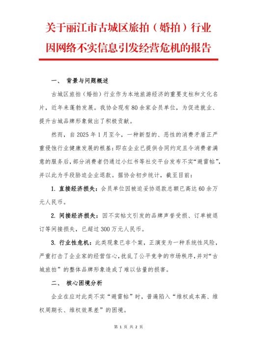 今年10月,麗江市古城區(qū)旅拍行業(yè)協(xié)會(huì)發(fā)布的《關(guān)于麗江市古城區(qū)旅拍(婚拍)行業(yè)因網(wǎng)絡(luò)不實(shí)信息引發(fā)經(jīng)營危機(jī)的報(bào)告》。