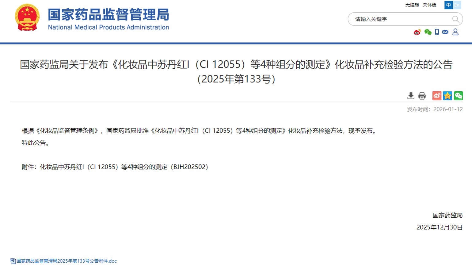 中新網(wǎng)北京1月13日電(記者 左雨晴) 國家藥監(jiān)局近日批準(zhǔn)《化妝品中蘇丹紅I(CI 12055)等4種組分的測(cè)定》化妝品補(bǔ)充檢驗(yàn)方法,該方法適用于液體(水、油)類、膏霜乳類、粉劑類、塊狀類、蠟基類化妝品中蘇丹紅Ⅰ、蘇丹紅Ⅱ、蘇丹紅Ⅲ、蘇丹紅Ⅳ的含量測(cè)定。