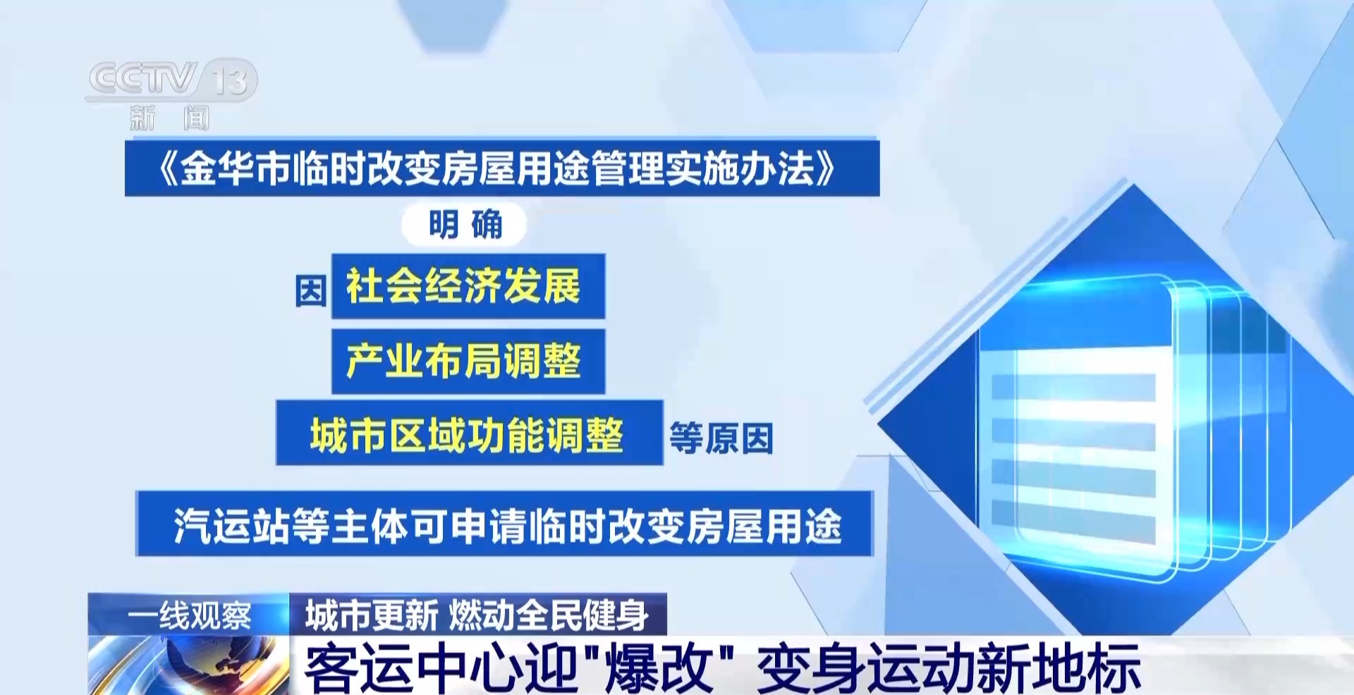 為破解城市更新中業(yè)態(tài)轉(zhuǎn)型難題,金華市出臺(tái)了臨時(shí)改變房屋用途管理實(shí)施辦法,明確因社會(huì)經(jīng)濟(jì)發(fā)展、產(chǎn)業(yè)布局調(diào)整、城市區(qū)域功能調(diào)整等原因,汽運(yùn)站等主體可申請(qǐng)臨時(shí)改變房屋用途。金華市汽車南站也成為首批受益的城市更新項(xiàng)目。