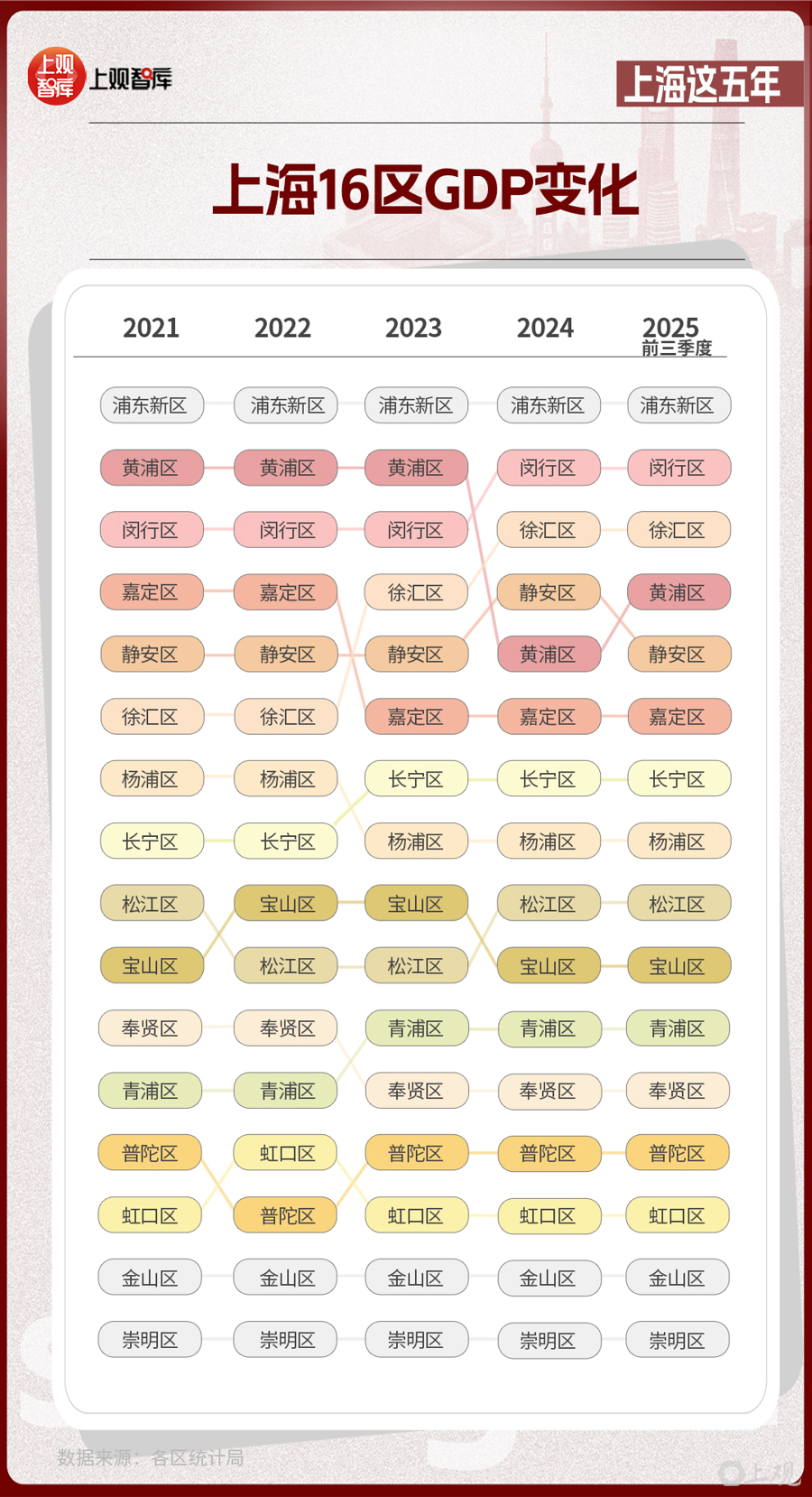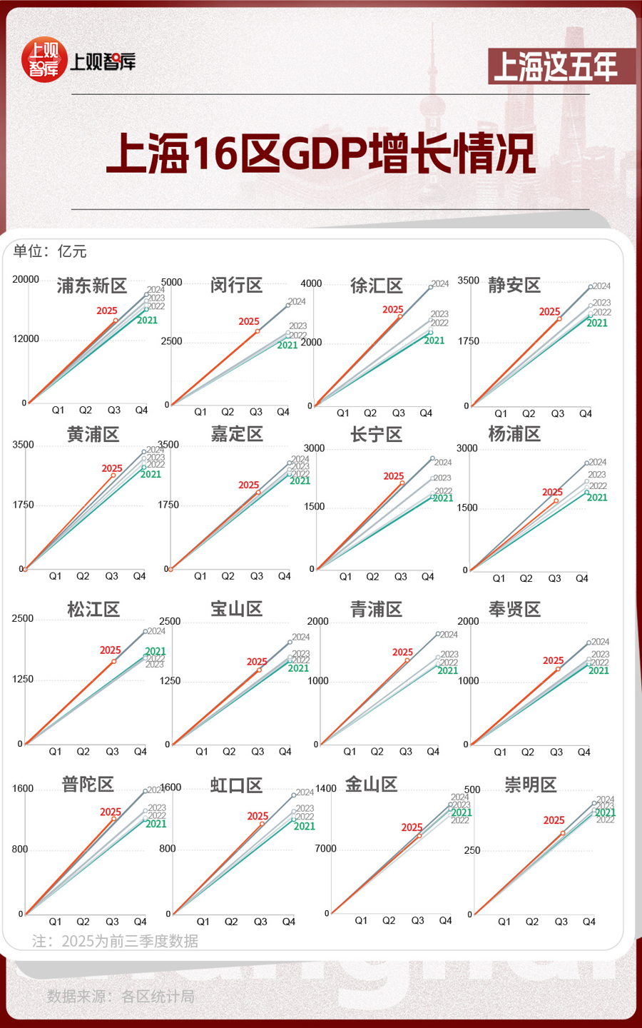 區(qū)域?qū)用?,上?6區(qū)GDP的變化,體現(xiàn)出從中心向多極擴散的趨勢。2021年,浦東新區(qū)GDP占全市近36%,而到了2025年,這一比重下降至約33%。其他區(qū)在這五年間,充分發(fā)揮自身優(yōu)勢,齊頭并進,為上海發(fā)展創(chuàng)造了更多增長極。