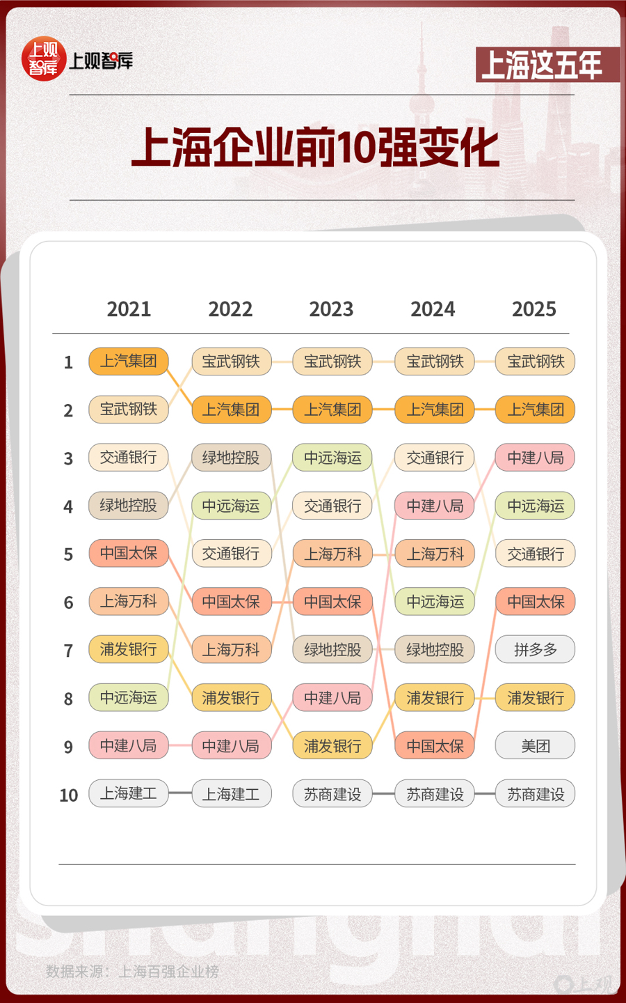 這份由上海市企業(yè)聯(lián)合會、上海市企業(yè)家協(xié)會、上海市經(jīng)濟團體聯(lián)合會和解放日報社共同發(fā)布的榜單,從2021年到2025年,見證了傳統(tǒng)企業(yè)的轉(zhuǎn)型與創(chuàng)新企業(yè)的涌現(xiàn)。在前10強的名單中,制造業(yè)仍然是上海產(chǎn)業(yè)的壓艙石,而房地產(chǎn)、建筑企業(yè)從2021年占比達40%,到2025年占比降低為20%。互聯(lián)網(wǎng)企業(yè)在2025年沖上前10強,并占據(jù)了20%的席位,亮出了上海經(jīng)濟多元發(fā)展的成績單。