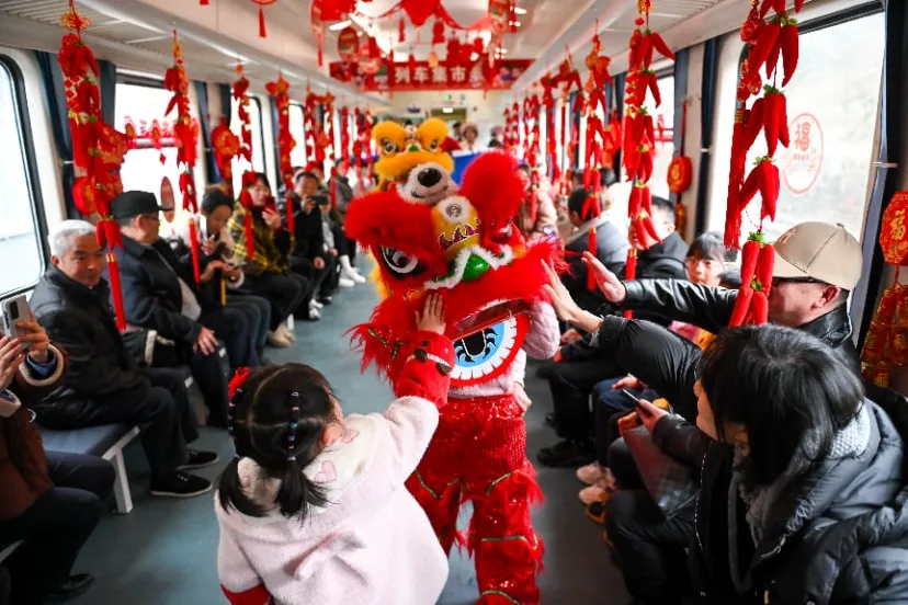 2024年2月23日,5630次列車上,旅客與舞獅互動(dòng)。當(dāng)日,在元宵節(jié)到來之際,形式多樣的鬧元宵活動(dòng)在貴州遵義開往重慶西的5630次公益性“慢火車”上舉行,吸引不少旅客參與其中,感受濃濃節(jié)日氣氛。 中新社記者 何蓬磊 攝