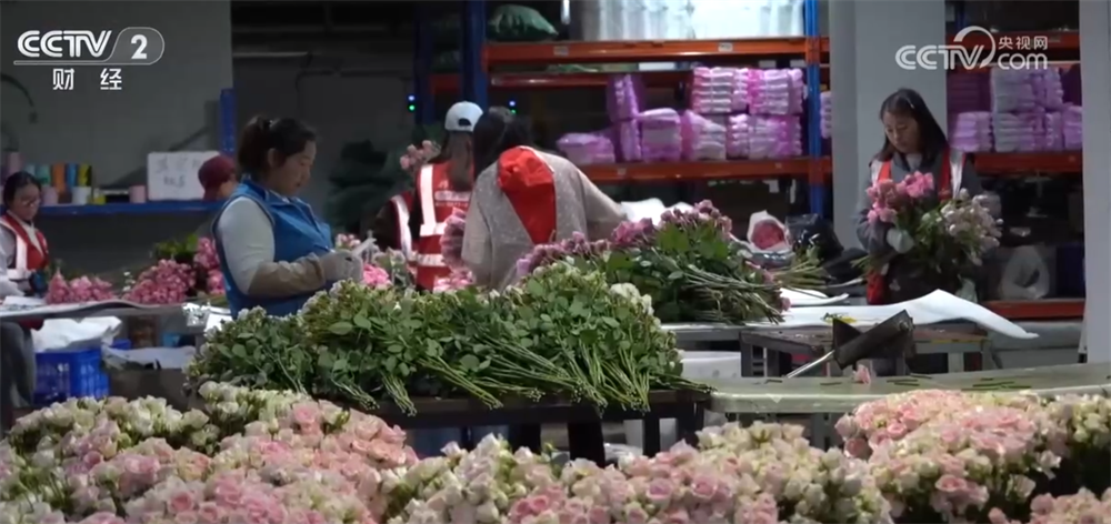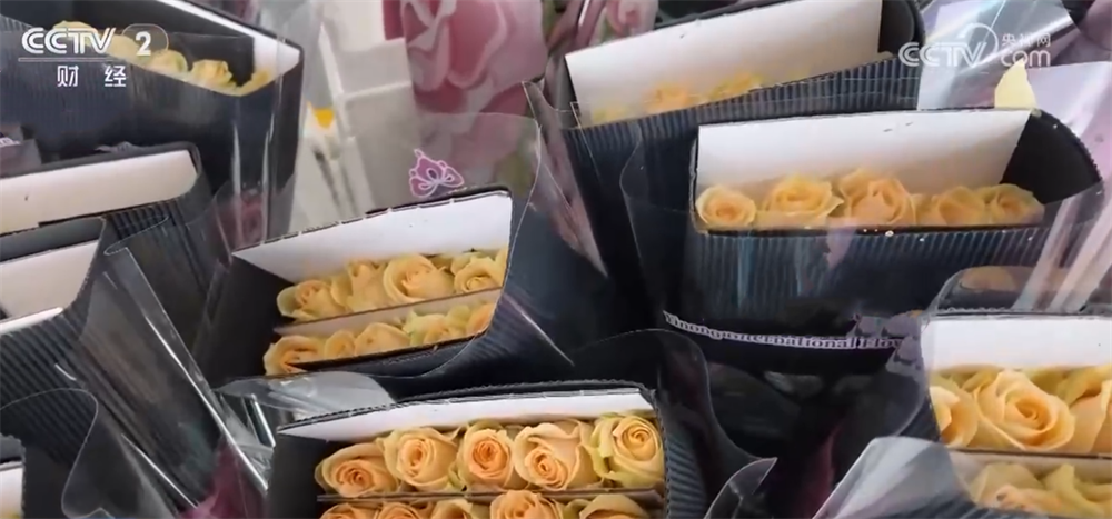 商家介紹,本月出口鮮花的發(fā)貨量是日常的五倍,目前訂單已經(jīng)排到年后。新鮮采摘的鮮花在出口商車間完成分揀、包裝、保鮮等處理后,由冷鏈送往機場過關(guān)出口,整個流程最快不到20小時就能完成。