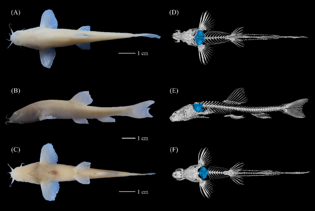 這是“納雍盲高原鰍”的外形及骨骼對比圖,研究人員從背面、側(cè)面以及腹面對這一新種的外形和內(nèi)部骨骼進行了對比。(受訪者供圖)