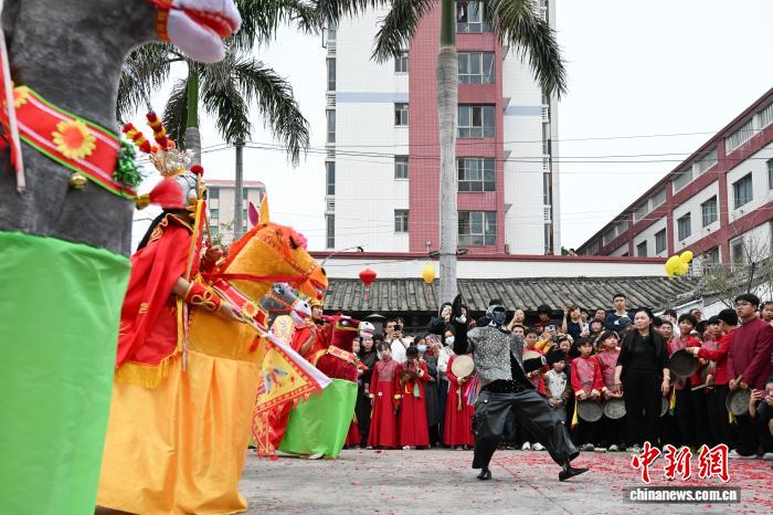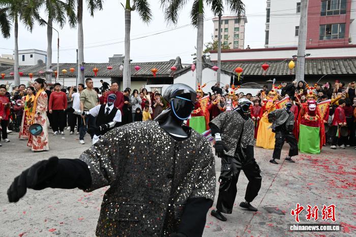 2月24日,廣東省潮州市田頭何村開展民俗巡游活動,機(jī)器人與布馬舞舞者共舞,吸引村民觀看。中新社記者 陳楚紅 攝