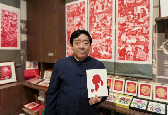 工坊中央,克樹利被層層觀眾圍住,叫好聲此起彼伏。只見他手持一張巴掌大的紅紙,目光在人群中一掃,隨手拉住前排一位扎馬尾辮的小姑娘,手上的剪刀便如游龍般翻飛起來。不畫底稿、不做標記,紅紙在他手中旋轉(zhuǎn)變形,幾十秒的工夫,一把剪刀開合之間,一張惟妙惟肖的人影剪紙便已成型——俏皮的馬尾辮、抿著嘴的笑臉,甚至連小姑娘頭頂上的發(fā)卡都清晰可見?!跋瘢√窳?!”圍觀人群中爆發(fā)出一陣熱烈的掌聲,小姑娘捧著剪紙,喜笑顏開。