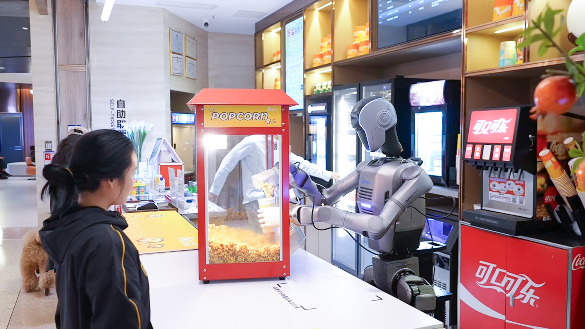 “滴——識別成功,開始制作?!鄙钲贙11影院的爆米花柜臺前,人形機器人抓起一只空紙杯,對準出料口,金黃的爆米花簌簌落入杯中,不多不少恰好至刻度線。封口、遞送,動作雖機械但流暢。