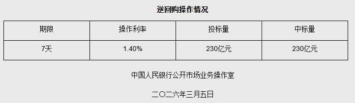 中國(guó)網(wǎng)3月5日訊 據(jù)央行網(wǎng)站消息,2026年3月5日中國(guó)人民銀行以固定利率、數(shù)量招標(biāo)方式開展了230億元7天期逆回購操作。具體情況如下:
