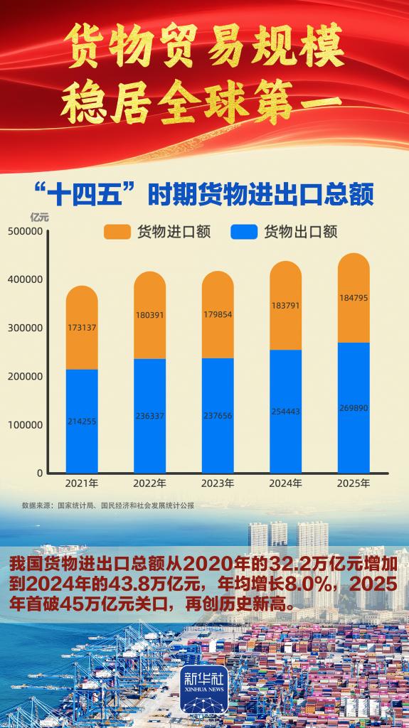 “十四五”勝利收官,“十五五”嶄新開局。我國經(jīng)濟總量完成“四連跳”,躍上140萬億元大關(guān),經(jīng)濟實力、科技實力、綜合國力躍上新臺階,中國式現(xiàn)代化邁出新的堅實步伐,第二個百年奮斗目標新征程實現(xiàn)良好開局。2026年全國兩會召開,舉世矚目。我們梳理出九組數(shù)據(jù),一起感受勝利收官的壯闊歷程、啟新開局的高光時刻。