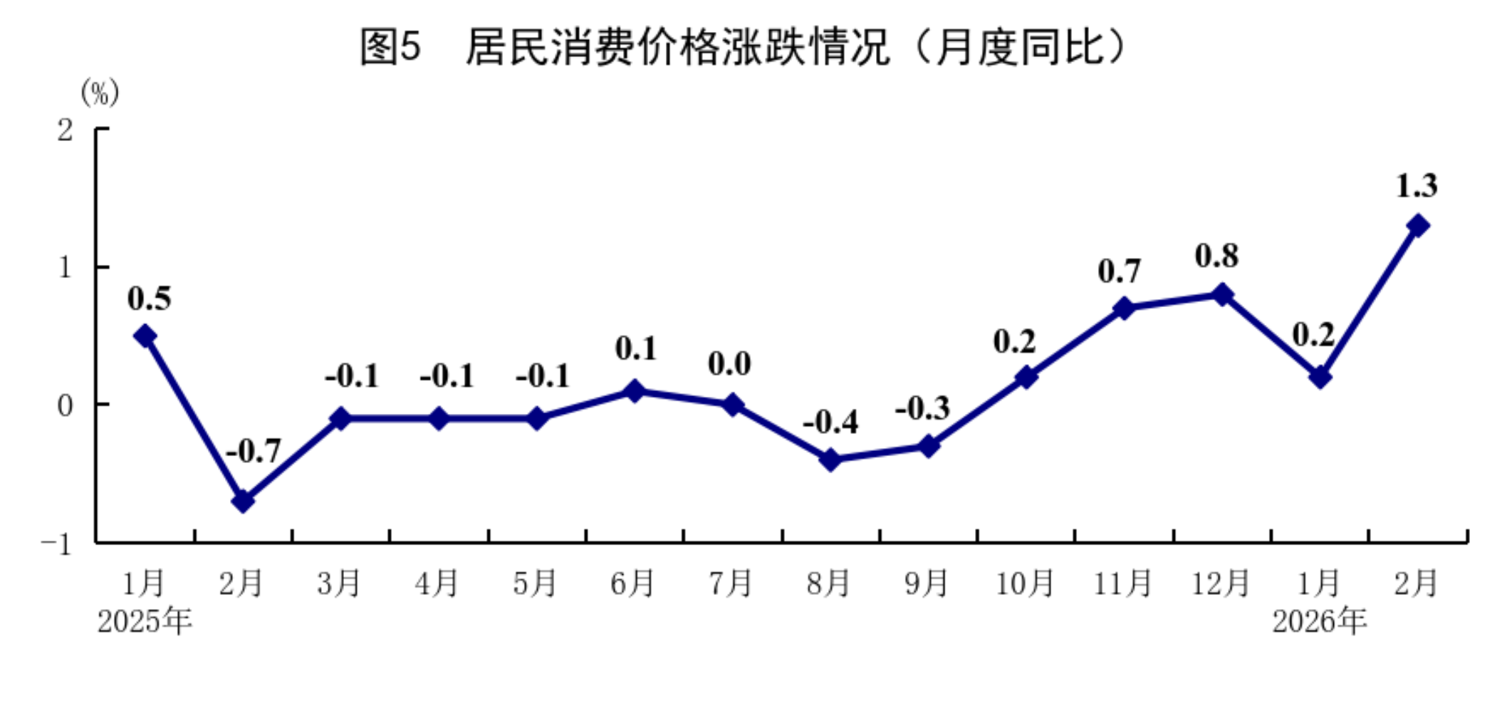 1—2月份,全國居民消費價格(CPI)同比上漲0.8%,其中1月份上漲0.2%,2月份上漲1.3%。分類別看,1—2月份,食品煙酒及在外餐飲價格同比上漲0.6%,衣著價格上漲1.9%,居住價格下降0.1%,生活用品及服務價格上漲2.7%,交通通信價格下降2.1%,教育文化娛樂價格上漲1.0%,醫(yī)療保健價格上漲1.8%,其他用品及服務價格上漲14.3%。在食品煙酒及在外餐飲價格中,豬肉價格下降11.2%,糧食價格下降0.2%,鮮果價格上漲4.5%,鮮菜價格上漲8.8%??鄢称泛湍茉磧r格后的核心CPI同比上漲1.3%。從環(huán)比看,1月份,全國居民消費價格上漲0.2%,2月份上漲1.0%。