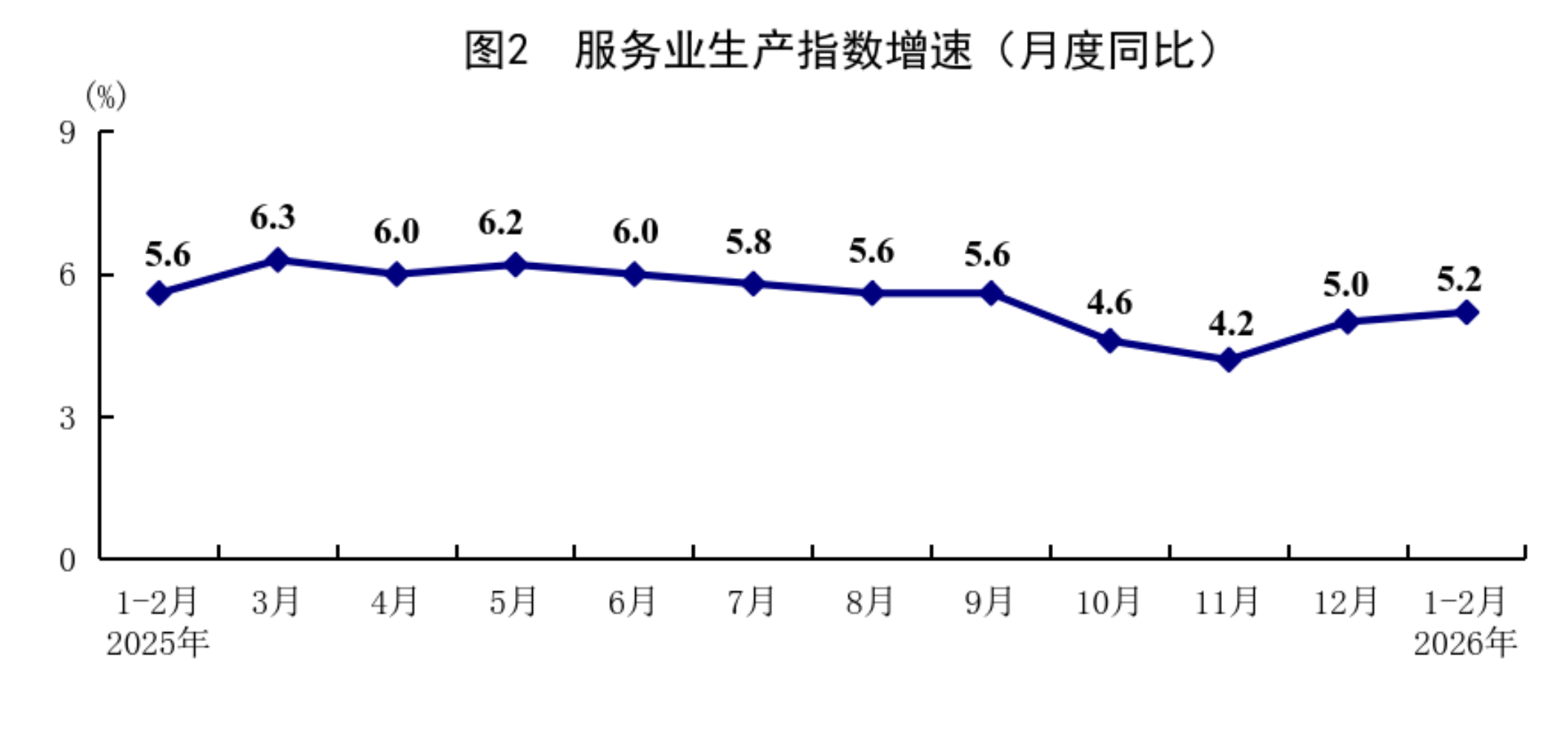 1—2月份,全國服務業(yè)生產(chǎn)指數(shù)同比增長5.2%,比上年12月份加快0.2個百分點。分行業(yè)看,信息傳輸、軟件和信息技術服務業(yè),租賃和商務服務業(yè),金融業(yè),交通運輸、倉儲和郵政業(yè),住宿和餐飲業(yè)生產(chǎn)指數(shù)分別增長10.1%、8.2%、7.0%、6.3%、5.4%。2月份,服務業(yè)商務活動指數(shù)為49.7%,比上月上升0.2個百分點;服務業(yè)業(yè)務活動預期指數(shù)為55.8%。其中,住宿、餐飲、文化體育娛樂等行業(yè)商務活動指數(shù)位于60.0%以上高位景氣區(qū)間。