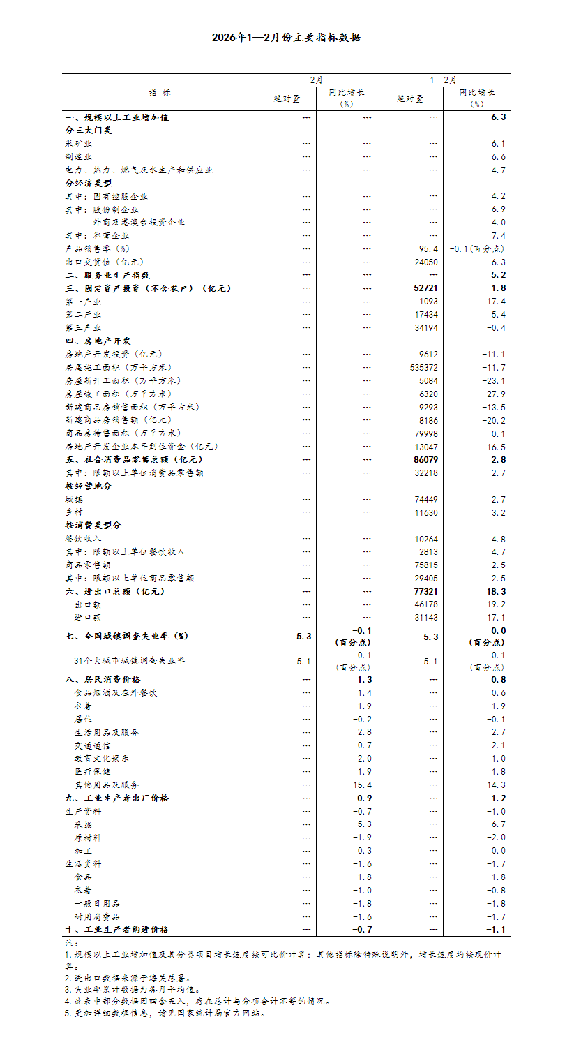 1—2月份,全國固定資產(chǎn)投資(不含農(nóng)戶)52721億元,同比增長1.8%,上年全年為下降3.8%;扣除房地產(chǎn)開發(fā)投資,全國固定資產(chǎn)投資增長5.2%。分領域看,基礎設施投資同比增長11.4%,制造業(yè)投資增長3.1%,房地產(chǎn)開發(fā)投資下降11.1%。全國新建商品房銷售面積9293萬平方米,同比下降13.5%;新建商品房銷售額8186億元,下降20.2%。分產(chǎn)業(yè)看,第一產(chǎn)業(yè)投資同比增長17.4%,第二產(chǎn)業(yè)投資增長5.4%,第三產(chǎn)業(yè)投資下降0.4%。民間投資同比下降2.6%,降幅比上年全年收窄3.8個百分點;扣除房地產(chǎn)開發(fā)投資,民間投資增長1.0%。高技術產(chǎn)業(yè)投資同比增長5.1%,其中航空、航天器及設備制造業(yè),研發(fā)與設計服務業(yè),信息服務業(yè)投資分別增長20.2%、20.6%、16.5%。從環(huán)比看,2月份固定資產(chǎn)投資(不含農(nóng)戶)比上月增長0.39%。
