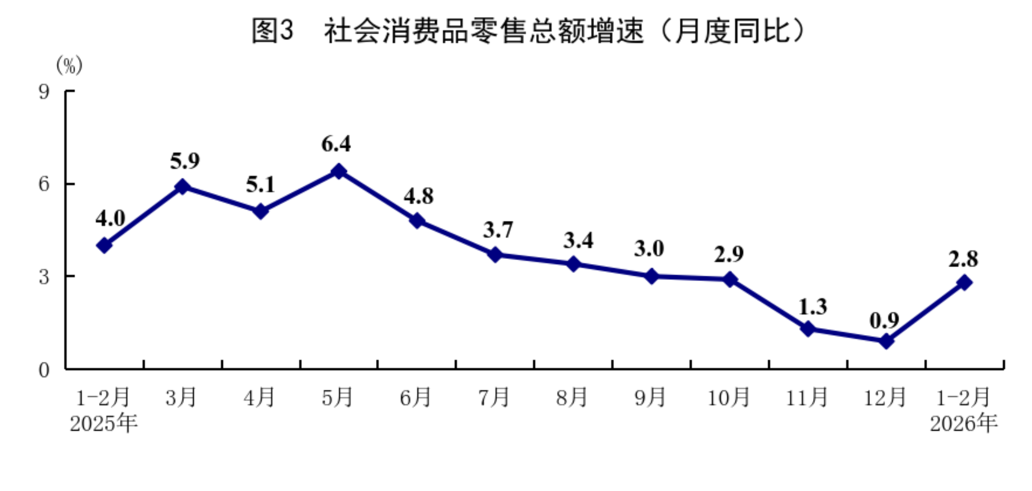 1—2月份,社會消費品零售總額86079億元,同比增長2.8%,比上年12月份加快1.9個百分點。按經(jīng)營單位所在地分,城鎮(zhèn)消費品零售額74449億元,增長2.7%;鄉(xiāng)村消費品零售額11630億元,增長3.2%。按消費類型分,商品零售額75815億元,增長2.5%;餐飲收入10264億元,增長4.8%。基本生活類和部分升級類商品銷售增長較快。限額以上單位服裝鞋帽針紡織品類、糧油食品類、通訊器材類、金銀珠寶類商品零售額同比分別增長10.4%、10.2%、17.8%、13.0%。從環(huán)比看,2月份社會消費品零售總額比上月增長0.81%。1—2月份,服務零售額同比增長5.6%,比上年全年加快0.1個百分點。其中,通訊信息服務類、旅游咨詢租賃服務類、文體休閑服務類零售額較快增長。1—2月份,全國網(wǎng)上商品和服務零售額32546億元,同比增長9.2%。其中,網(wǎng)上商品零售額20812億元,增長10.3%,占社會消費品零售總額的比重為24.2%;網(wǎng)上服務零售額11734億元,增長7.3%。