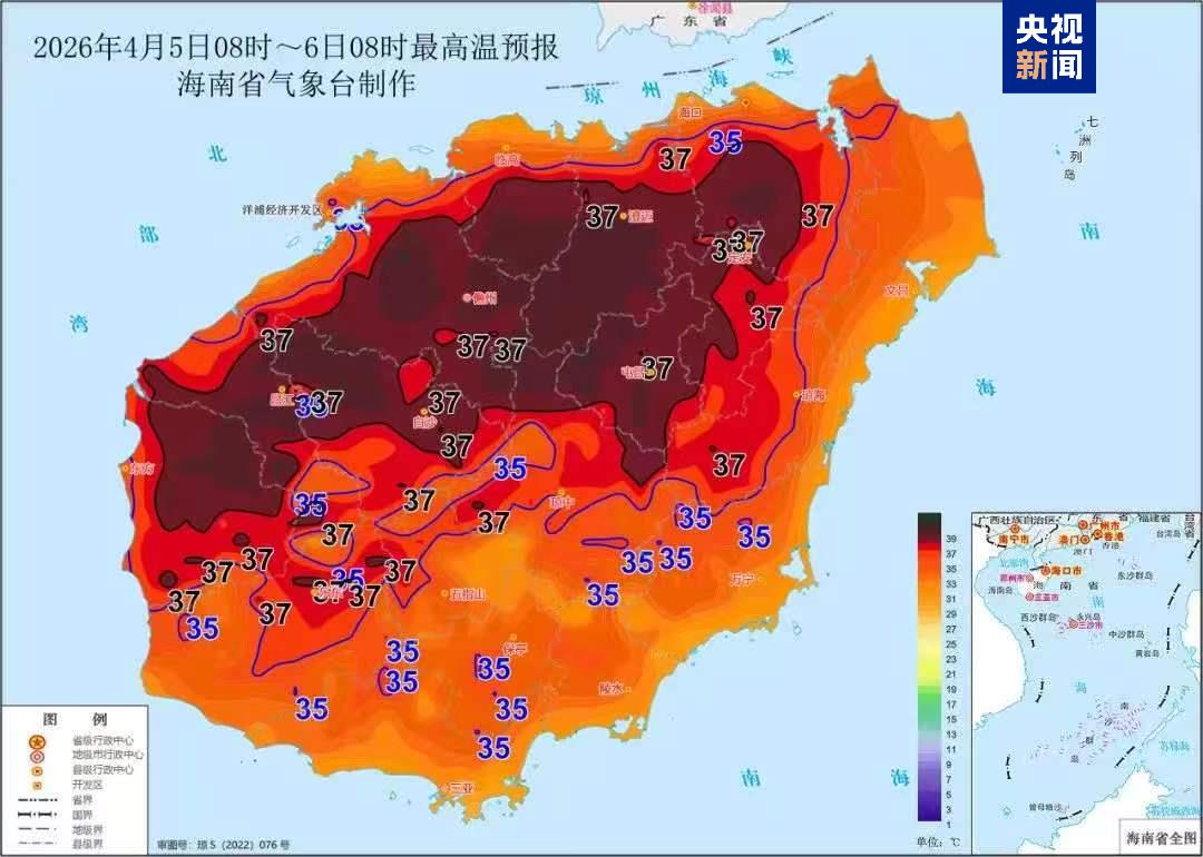海南省氣象局4月5日下午繼續(xù)發(fā)布高溫四級預(yù)警:預(yù)計(jì)4月6日白天,???、澄邁、臨高、定安、屯昌、儋州、白沙、昌江和東方等9個(gè)市縣的大部分鄉(xiāng)鎮(zhèn)將出現(xiàn)37℃以上的高溫天氣,請有關(guān)單位做好防暑降溫、森林防滅火等相關(guān)工作。
