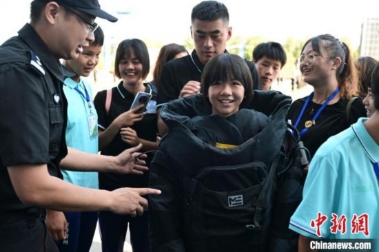 7月9日,隊員們觀看特警訓(xùn)練及警犬演示,現(xiàn)場體驗(yàn)警械武器和警車等裝備使用,民警講解安全防范知識。