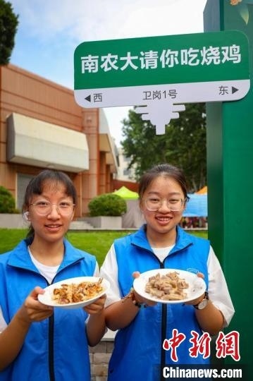 迎新現(xiàn)場,南京農業(yè)大學食品科技學院精心制備“南農燒雞”,為新生和家長了解學校特色、食品特色提供直觀感受。泱波 攝