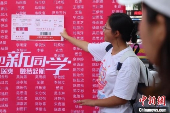 新生手持夢想“機票”打卡新生名單墻。泱波 攝