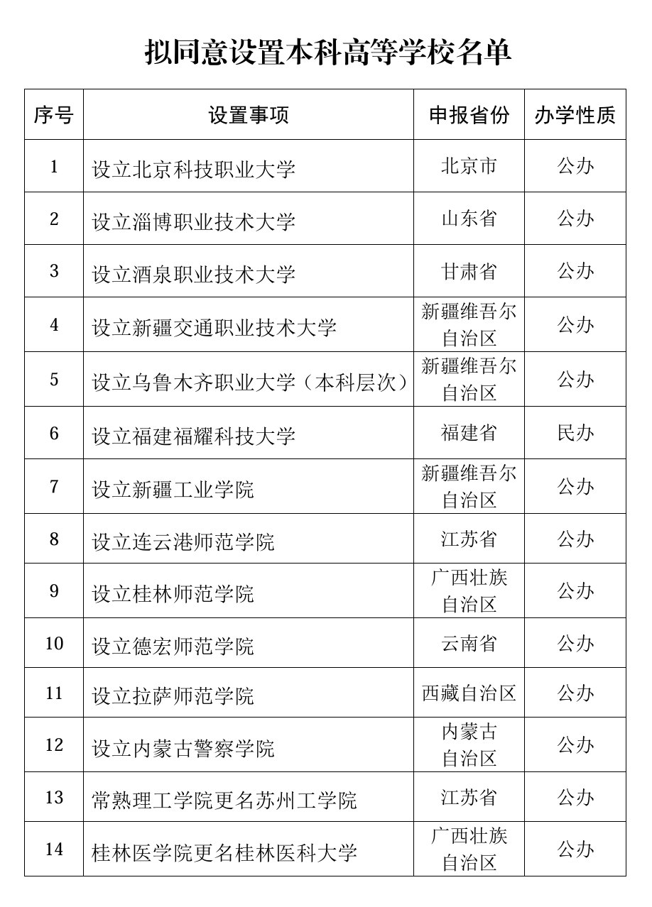 人民網(wǎng)北京1月13日電 (記者孫競)教育部今天發(fā)布關(guān)于擬同意設(shè)置本科高等學(xué)校的公示。根據(jù)《中華人民共和國高等教育法》《普通高等學(xué)校設(shè)置暫行條例》《普通本科學(xué)校設(shè)置暫行規(guī)定》《本科層次職業(yè)學(xué)校設(shè)置標(biāo)準(zhǔn)(試行)》等有關(guān)規(guī)定以及第八屆全國高等學(xué)校設(shè)置評(píng)議委員會(huì)考察評(píng)議結(jié)果,經(jīng)教育部黨組會(huì)議審議,擬同意設(shè)置北京科技職業(yè)大學(xué)等14所學(xué)校。公示時(shí)間為2025年1月13日至1月17日。