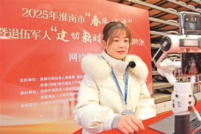 近日,安徽省淮南市舉行2025年“春風(fēng)送暖”大型招聘會(huì),351家企業(yè)提供近萬(wàn)個(gè)工作崗位。圖為一名主播在招聘會(huì)現(xiàn)場(chǎng)進(jìn)行網(wǎng)絡(luò)直播助力就業(yè)。