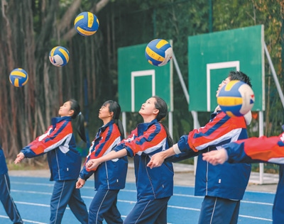 福建省福州市鼓樓區(qū)水部街道閩江學院附屬中學,學生們在課間練習排球。