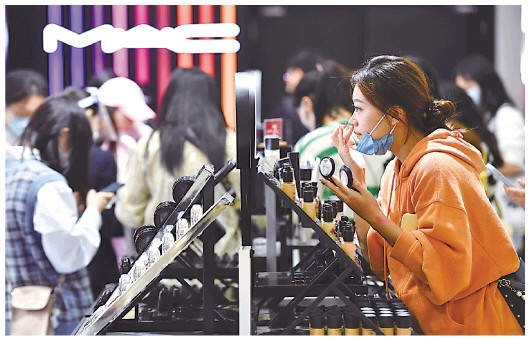 1月3日,顧客在??谌赵聫V場免稅店選購化妝品。新華社記者 郭程 攝