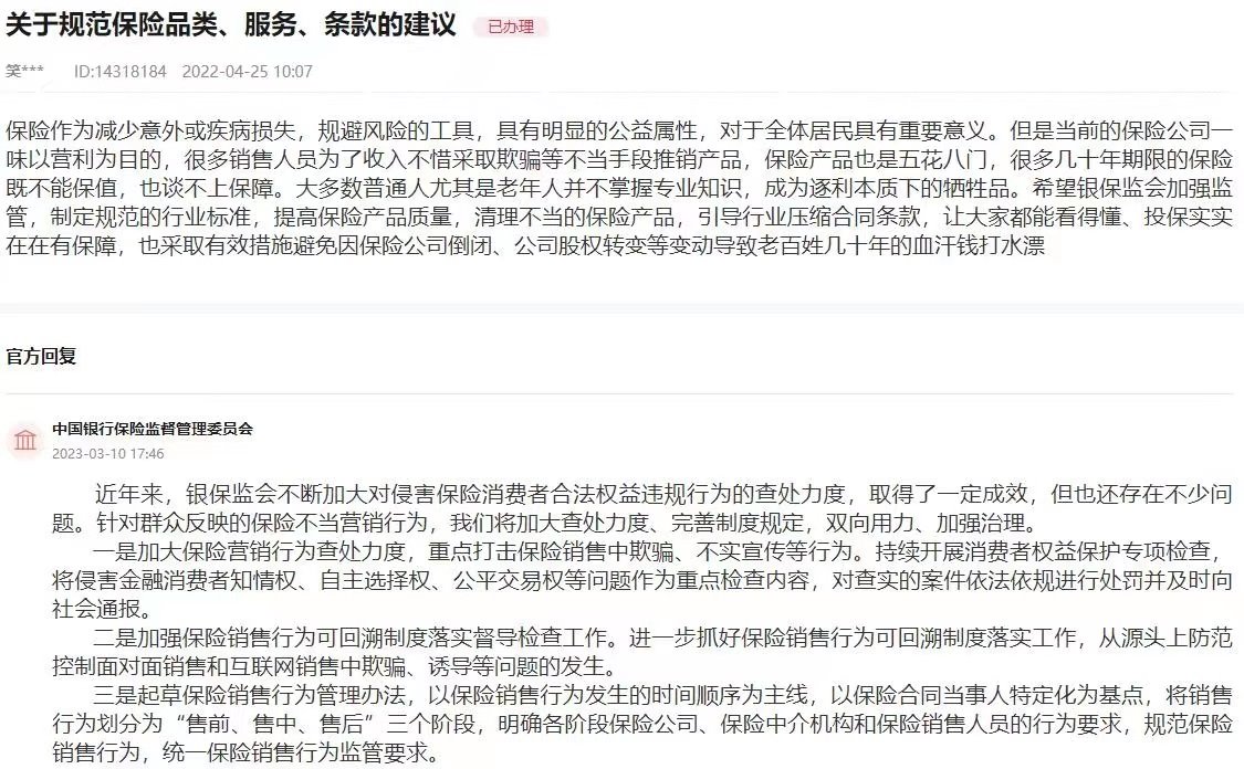 “近年來,銀保監(jiān)會不斷加大對侵害保險消費者合法權益違規(guī)行為的查處力度,取得了一定成效,但也還存在不少問題?!便y保監(jiān)會在回復中表示,針對群眾反映的保險不當營銷行為,將加大查處力度、完善制度規(guī)定,雙向用力、加強治理。