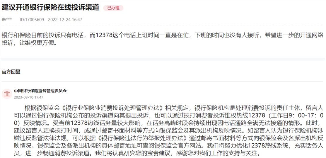 針對網友提出的“建議開通銀行保險在線投訴渠道”,銀保監(jiān)會在回復中表示,將努力優(yōu)化消費者投訴維權熱線12378系統(tǒng),充實話務人員,進一步暢通消費投訴渠道。