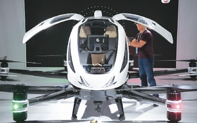 圖為廣交會(huì)新設(shè)置的新能源及智能網(wǎng)聯(lián)汽車展區(qū)內(nèi),采購(gòu)商在了解正在展示的飛行器產(chǎn)品。新華社記者 鄧 華攝