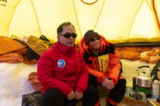姚檀棟(左)、湯普森在普若崗日冰原10號冰川冰穹C作業(yè)點(diǎn)工作帳篷內(nèi)查看作業(yè)情況時合影。新華社記者姜帆 攝