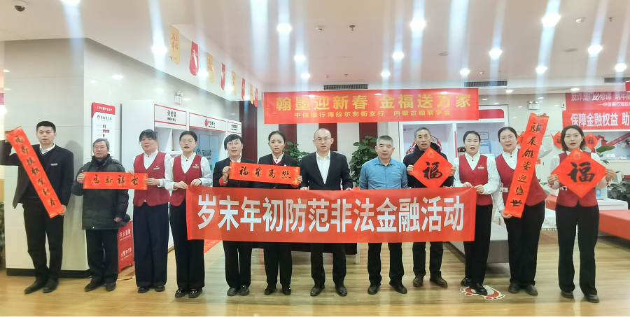 為營造喜慶祥和的新春氛圍,切實提升轄區(qū)群眾防范非法金融活動的意識和能力,近日,中信銀行呼和浩特海拉爾東街支行聯(lián)合內(nèi)蒙古楹聯(lián)學(xué)會,開展“翰墨迎新春 金福送萬家”主題活動,將傳統(tǒng)春聯(lián)文化與金融反詐知識深度融合,為市民送上一份別樣的“新春安全禮”。