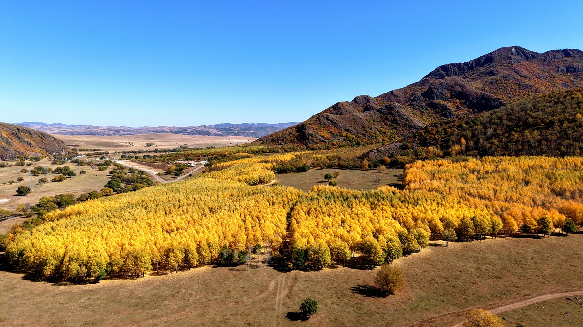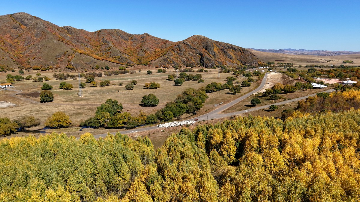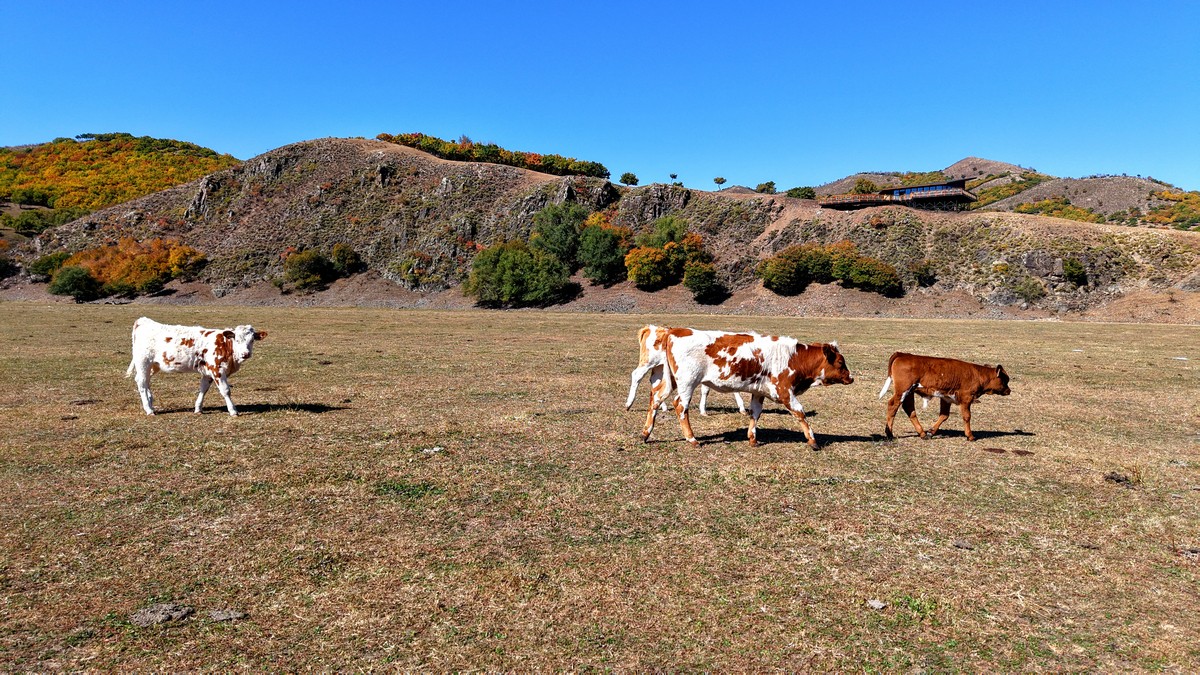 黑羊山旅游度假區(qū),海拔1319米,因這里的山形似黑羊頭得名。金秋時(shí)節(jié),整個(gè)景區(qū)被一片五彩斑斕的世界所籠罩,藍(lán)天、白云、溪流、牛羊群構(gòu)成一幅醉人的畫(huà)卷,恍若進(jìn)入童話(huà)世界。
