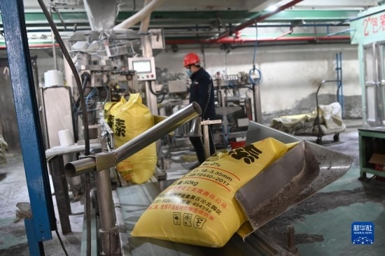 2月16日,在貴州省貴陽市開陽縣一家化肥生產(chǎn)企業(yè),工人駕駛叉車轉(zhuǎn)運(yùn)準(zhǔn)備外銷的化肥(無人機(jī)照片)。