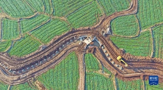 2月16日,在湖南省永州市道縣壽雁鎮(zhèn)芽洞村,工人駕駛挖掘機(jī)在高標(biāo)準(zhǔn)農(nóng)田建設(shè)項(xiàng)目現(xiàn)場(chǎng)施工(無人機(jī)照片)。