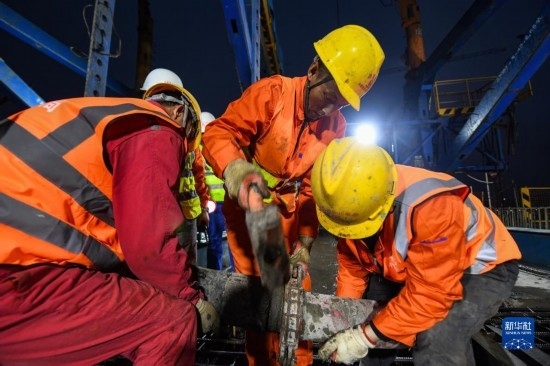 3月18日,在位于四川省瀘州市的渝昆高鐵瀘州沱江特大橋主跨合龍施工現(xiàn)場,施工人員在安裝混凝土運輸管道。